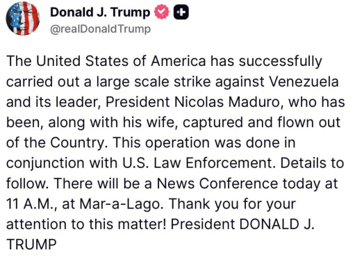 «Сполучені Штати Америки успішно здійснили широкомасштабний удар проти Венесуели та її лідера, президента Ніколаса Мадуро, якого разом із дружиною було захоплено та вивезено з країни», — йдеться у заяві Трампа.